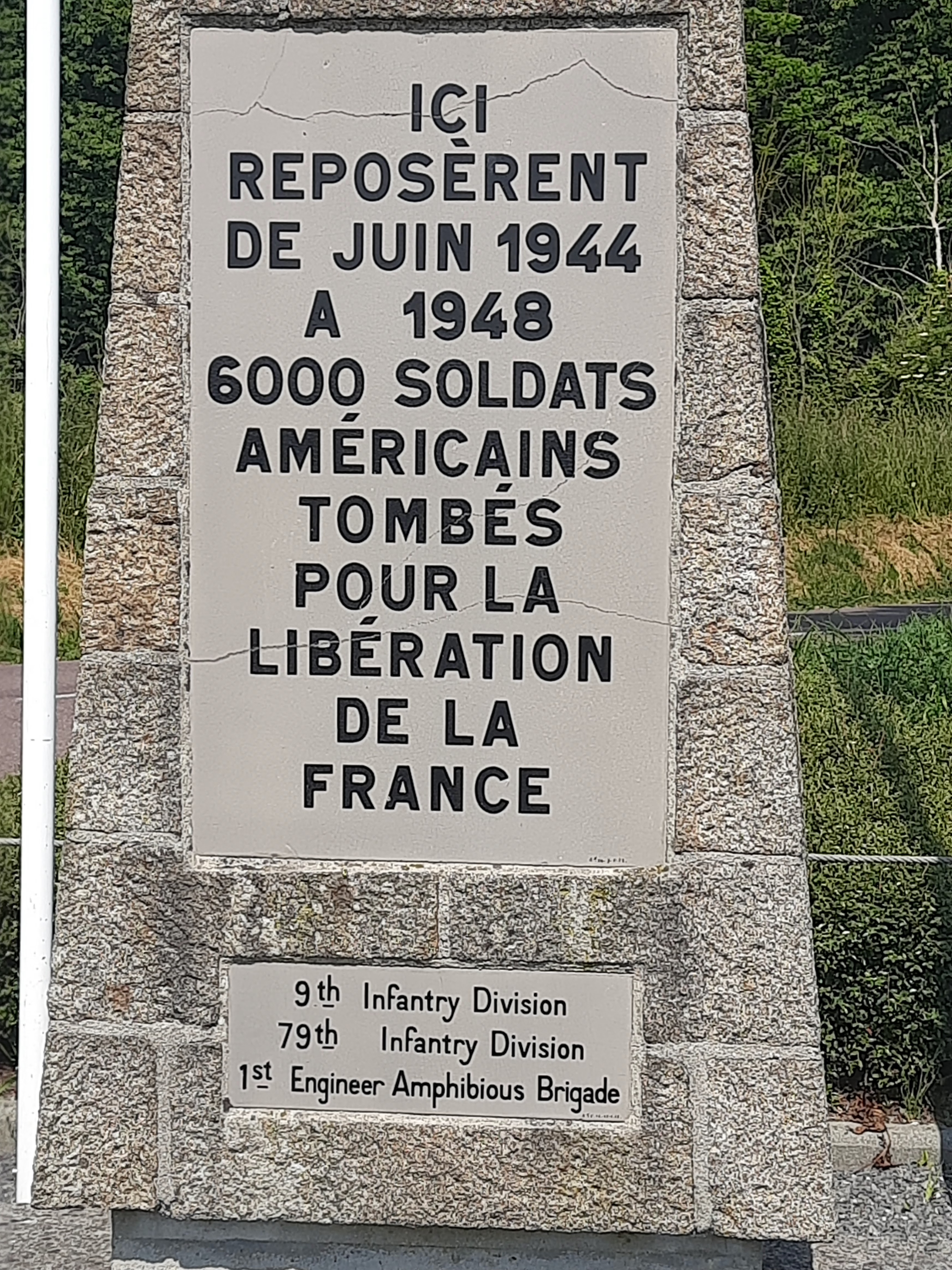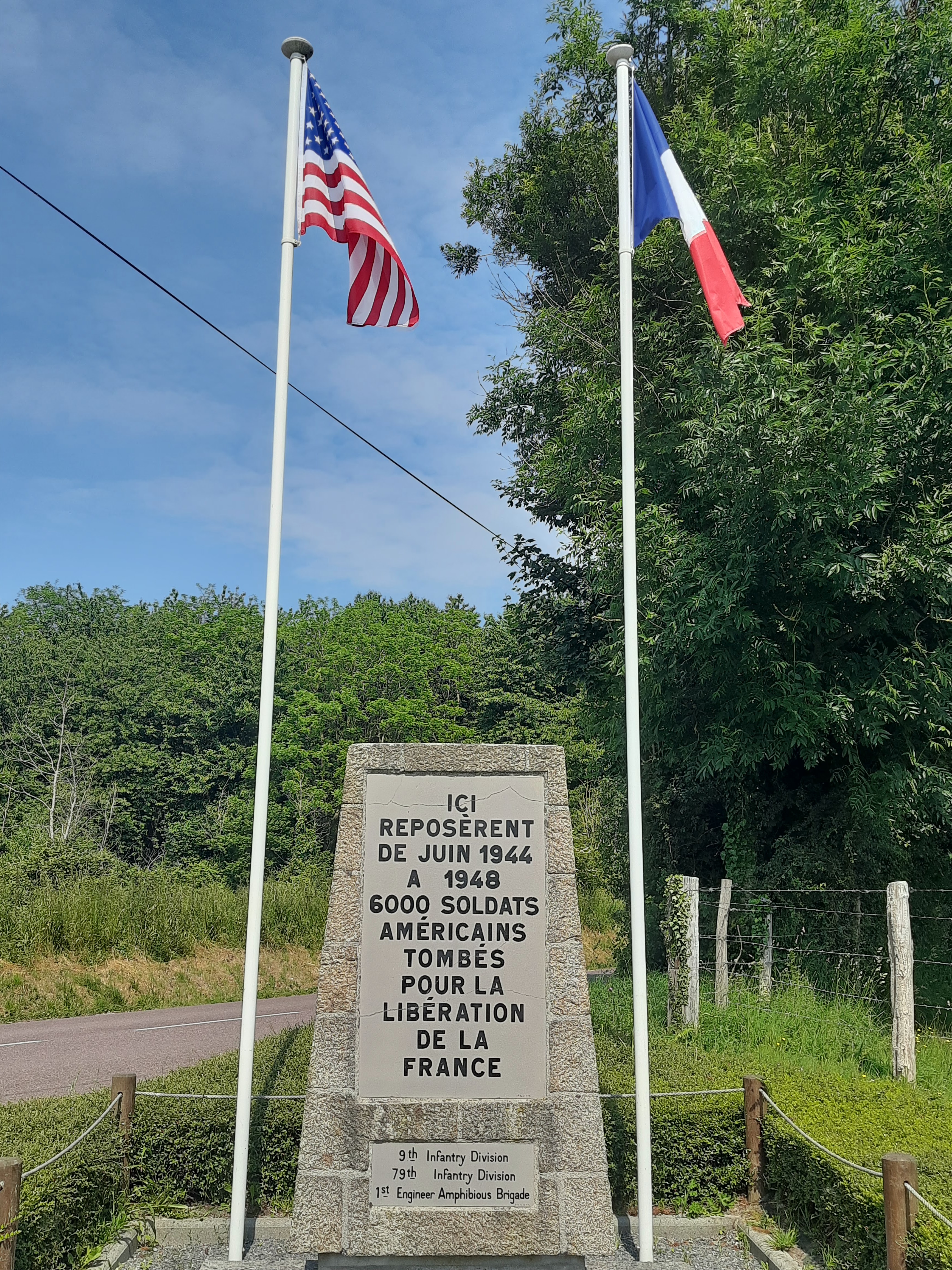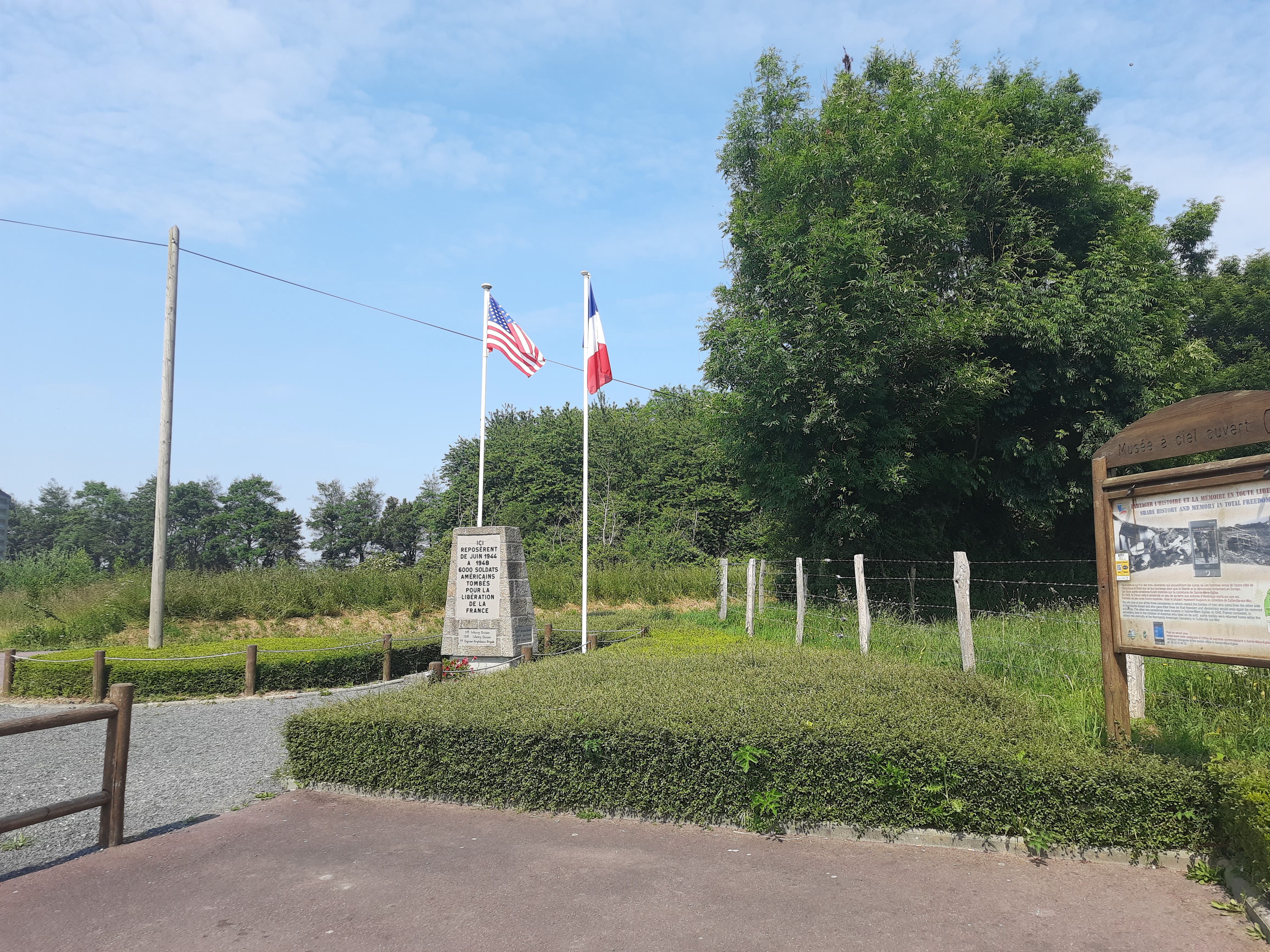 En bord de route, un monument matérialisant l'emplacement de l'un des trois cimetières militaires installés sur la commune de Sainte Mère l'Eglise en juin 1944. A sa fermeture en 1948, les dépouilles des soldats furent transférées au cimetière militaire américain de Colleville sur Mer. (Quelques unes furent rapatriées aux Etats-Unis).